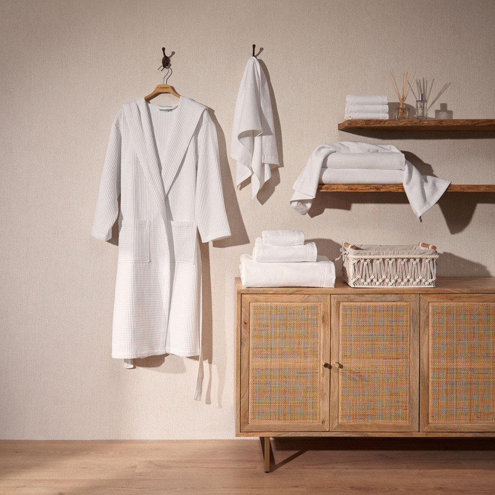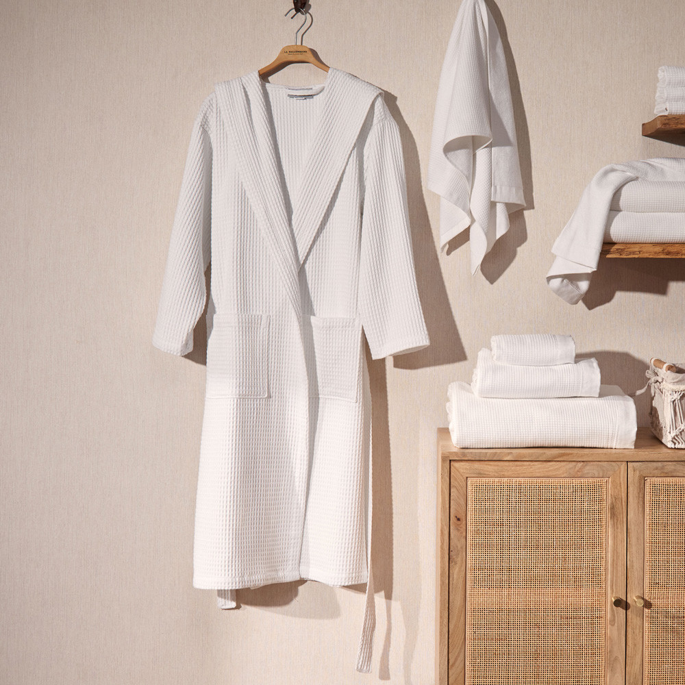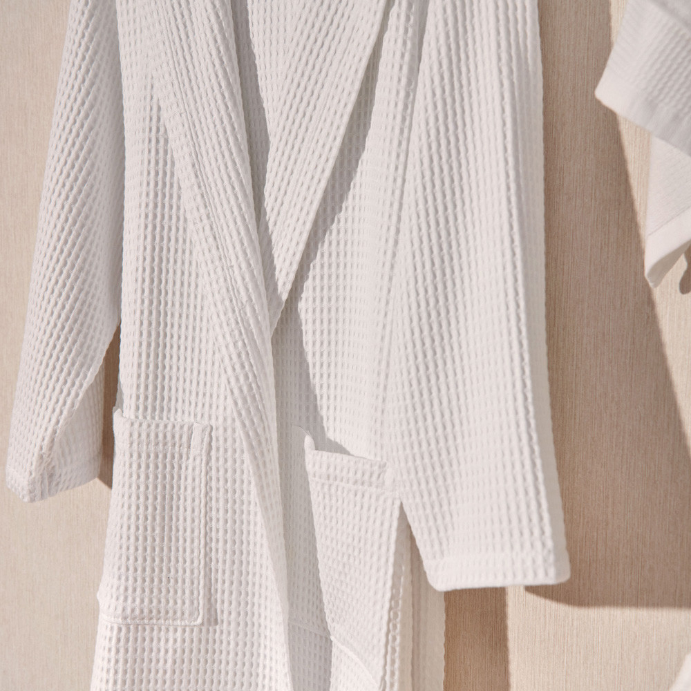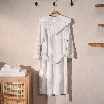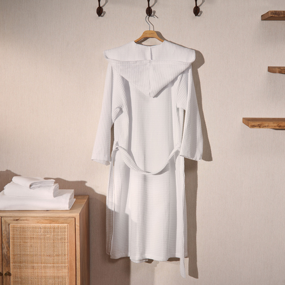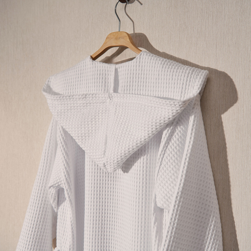 Barnús unisex de niu d'abella de cotó de 300gsm . Suau i molt absorbent. Estil smoking amb caputxam dues butxaques laterals i cinturó. Tallatge gran. Aquest producte té el certificat Oeko-Tex 100, que demostra que s'ha eliminat qualsevol substància nociva en el procés de producció, és segur per a la salut humana. Culmina el teu bany com una autèntica experiència.
