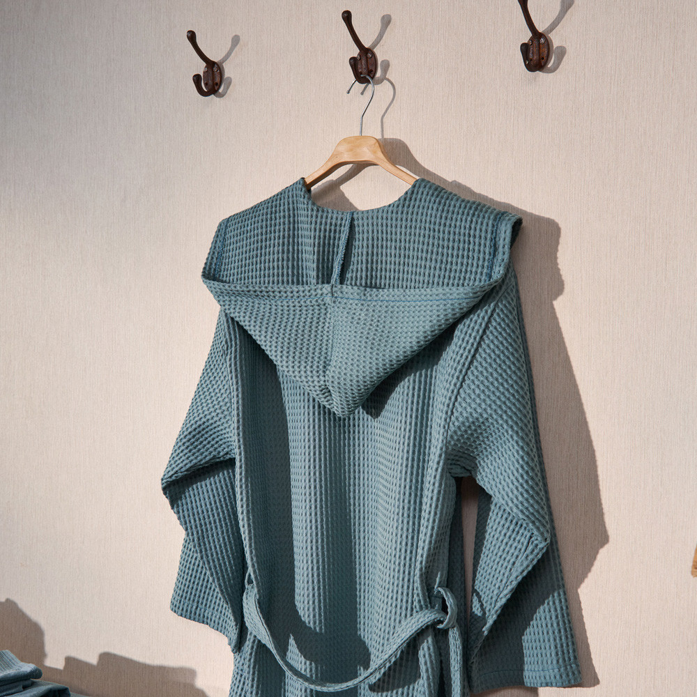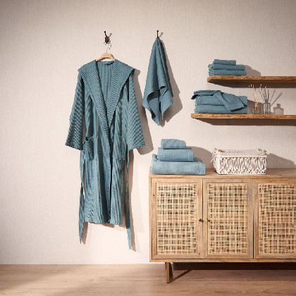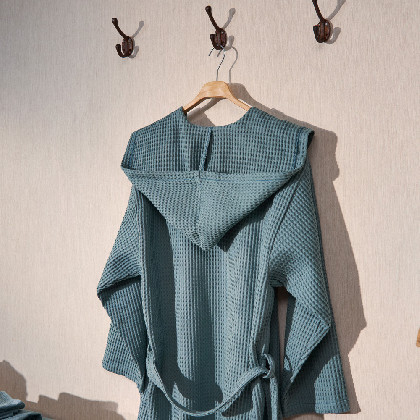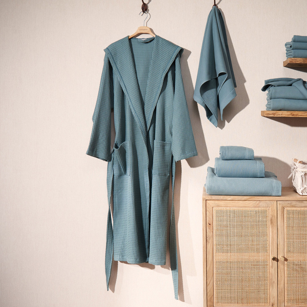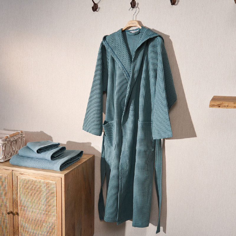 Barnús unisex de niu d'abella de cotó de 300gsm . Suau i molt absorbent. Estil smoking amb caputxam dues butxaques laterals i cinturó. Tallatge gran. Aquest producte té el certificat Oeko-Tex 100, que demostra que s'ha eliminat qualsevol substància nociva en el procés de producció, és segur per a la salut humana. Culmina el teu bany com una autèntica experiència.