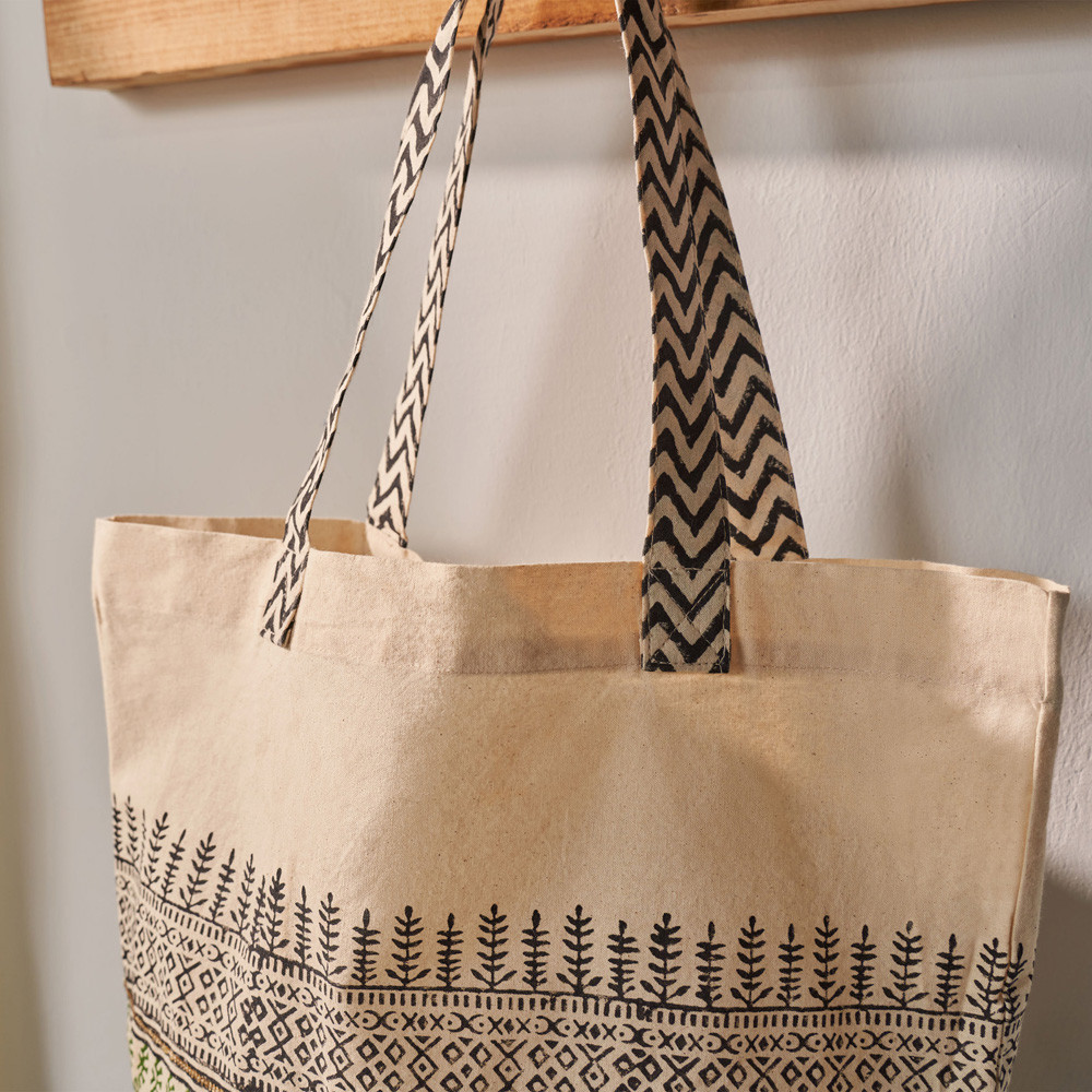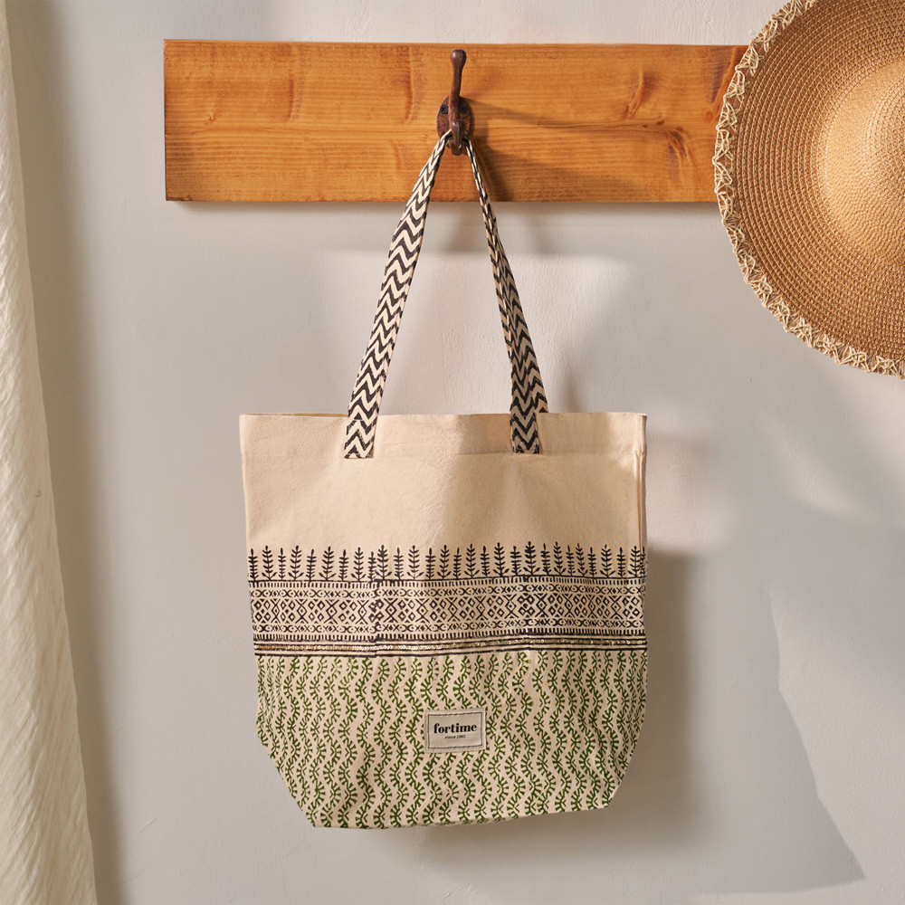 Bossa de platja de teixit de lona amb estampat ètnic en dos tons. Porta una doble nansa d’espatlla en lona estampada en verd. Logotip estampat en una peça de teixit de cotó. Té tancament de cremallera i disposa de tres butxaques interiors: dues al davant i una al darrere amb cremallera. Mesures: 30 (ample) × 10 (fons) × 38 (alt) cm.