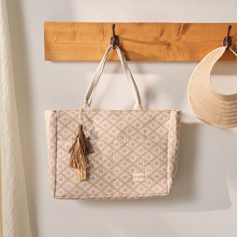 Bossa de platja de teixit de lona amb estampat ètnic en dos tons. Porta una doble nansa d’espatlla en lona estampada en verd. Logotip estampat en una peça de teixit de cotó. Té tancament de cremallera i disposa de tres butxaques interiors: dues al davant i una al darrere amb cremallera. Mesures: 30 (ample) × 10 (fons) × 38 (alt) cm.