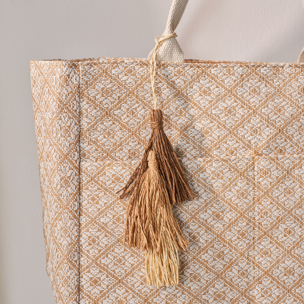 Necesser de platja de teixit natural de ràfia entrellaçada amb dibuixos geomètrics en color blanc. Porta una nansa de corda en color beix per al canell. Tancament amb cremallera. Logotip estampat en una peça de teixit de cotó. Mesures: 29 (ample) × 10,5 (fons) × 18 (alt) cm. És el complement ideal per guardar les claus, el mòbil, el maquillatge… i tenir-ho tot localitzat al moment.