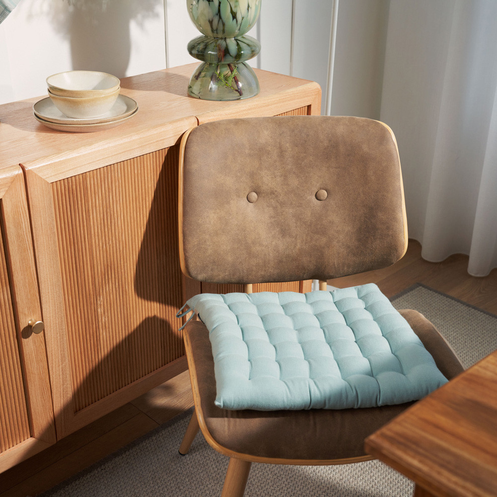 Coixí de cadira per protegir i decorar les teves cadires. Farcit encoixinat amb barreja de cotó, amb cintes per fixar i adaptar a la teva cadira. Es recomanda norentar a la rentadora, rentar a ma i assecar en horitzontal per evitar malformar el farcit. Disponible en altres colors. Combina´ls amb les nostres estovalles i col·leccions de cuina.