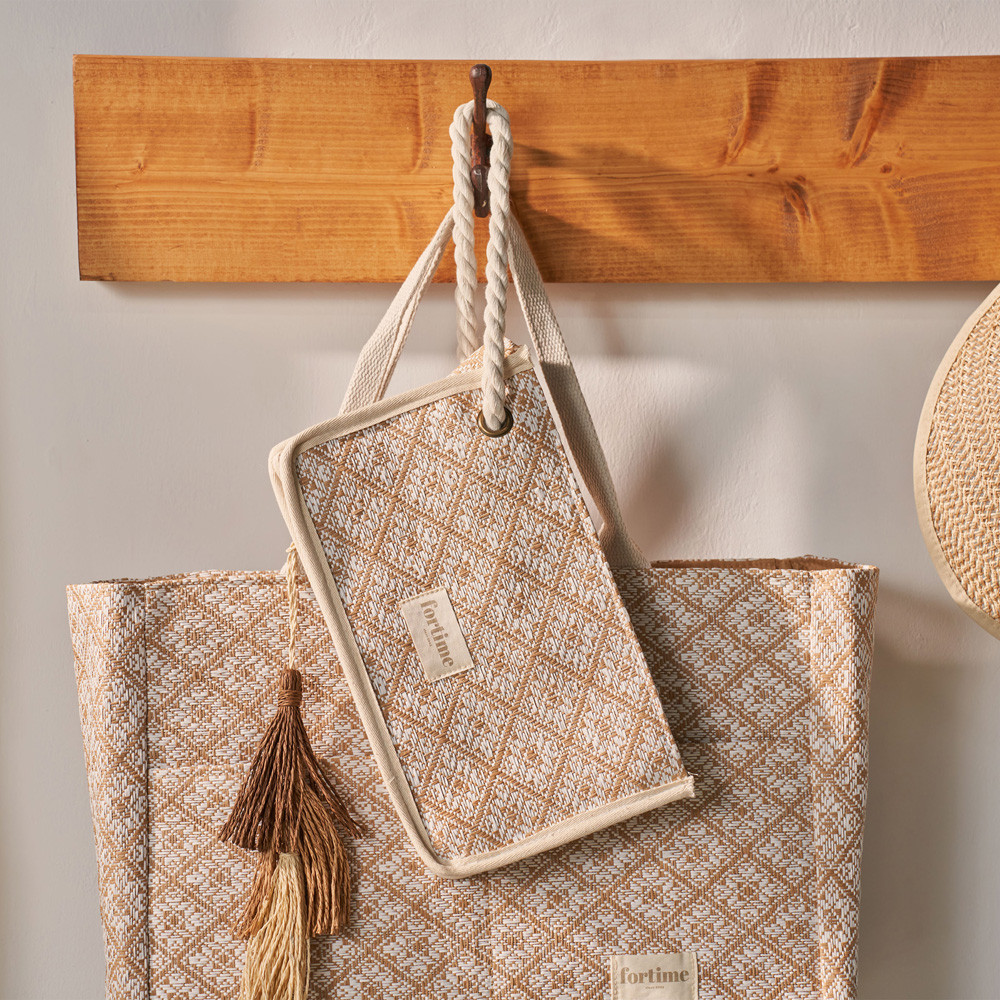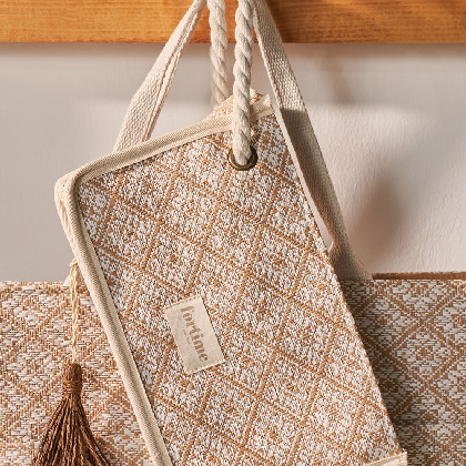 Necesser de platja de teixit natural de ràfia entrellaçada amb dibuixos geomètrics en color blau i blanc. Porta una nansa de corda en color blanc per al canell. Tancament amb cremallera. Logotip estampat en una peça de teixit de cotó. Mesures: 34 (ample) × 14 (fons) × 36 (alt) cm. És el complement ideal per guardar les claus, el mòbil, el maquillatge… i tenir-ho tot localitzat al moment.