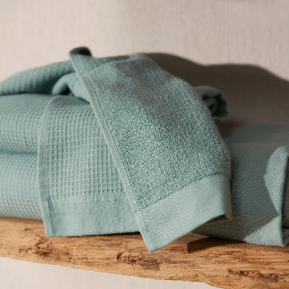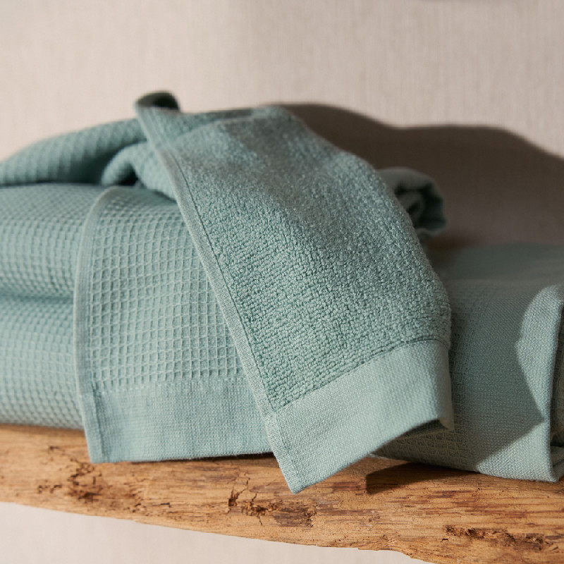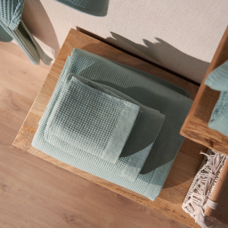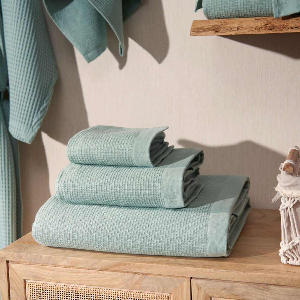 Tovalloles de niu d'abella per davant i ris americà per darrera. Densitat de 500 gsm de cotó cardat 100%. Tintades en reactiu, el que garanteix la solidesa de colors foscos. Gruixudes, esponjoses i amb una gran capacitat d´absorció. Aquest producte té el certificat Oeko-Tex 100, que demostra que s'ha eliminat qualsevol substància nociva en el procés de producció, és segur per a la salut humana. Barnús de bany a joc també disponibles.