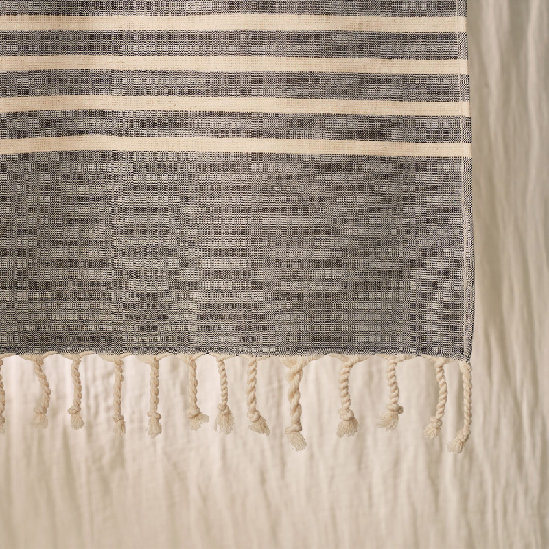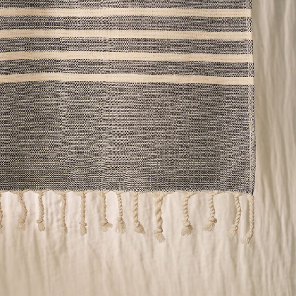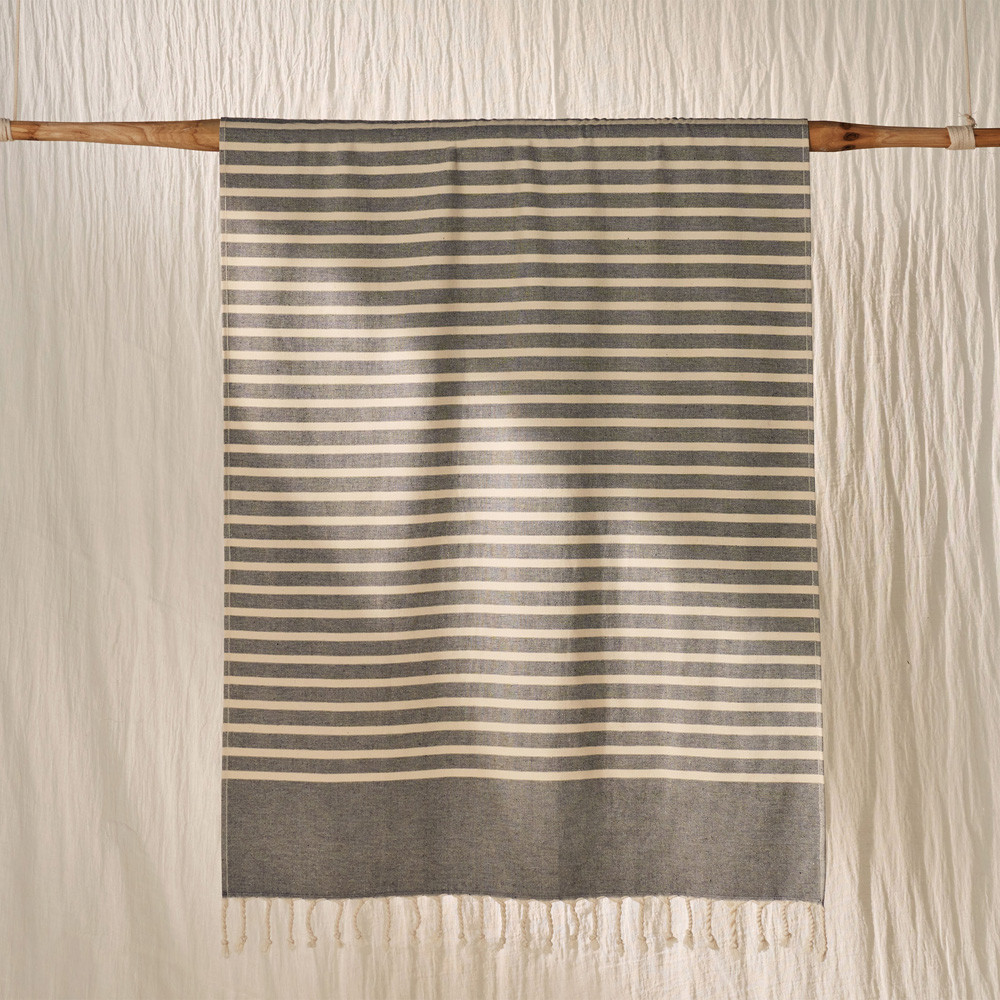 Una tovallola de platja Fouta, 100% cotó, amb una cara de ris per assegurar una excel·lent capacitat d'absorció i màxima suavitat. Molt lleugera i pràctica, ocupa poc lloc per les seves mides. Ideal per assecar-se i descansar al costat de l'aigua. Fabricat a Turquia.