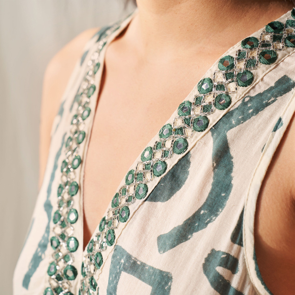 Vestit llarg sense mànigues i escot en V. El seu teixit és suau, molt agradable al tacte. Aquesta fibra es molt fresca i transpirable. Una peça de vestir molt còmoda i amb múltiples utilitats: per portar a la platja, per casa o on et vingui de gust. És el complement idear per a t'acompanyi aquest estiu.
