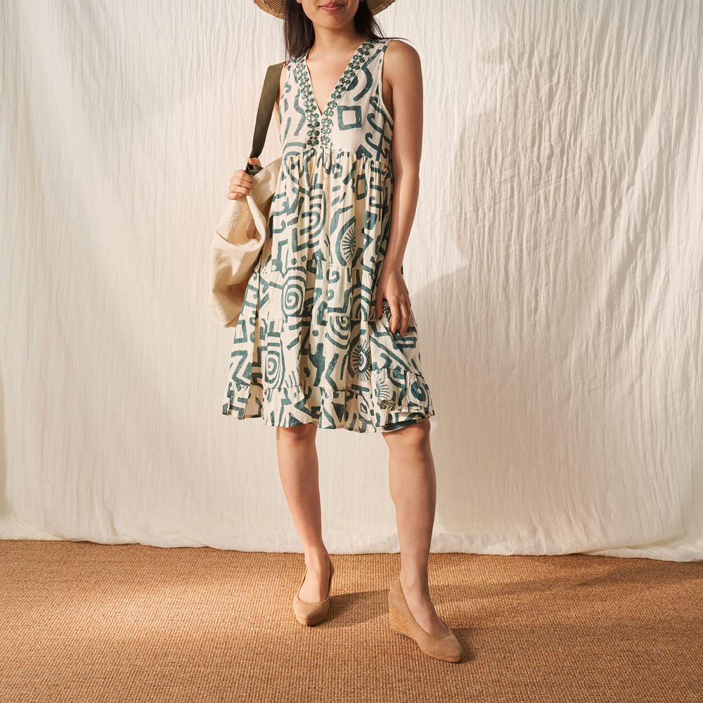 Vestit curt amb escot en V i detalls de borles. El seu teixit és suau, molt agradable al tacte. Aquesta fibra es molt fresca i transpirable. Una peça de vestir molt còmoda i amb múltiples utilitats: per portar a la platja, per casa o on et vingui de gust. És el complement idear per a t'acompanyi aquest estiu.
