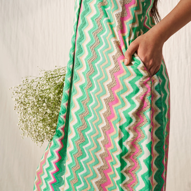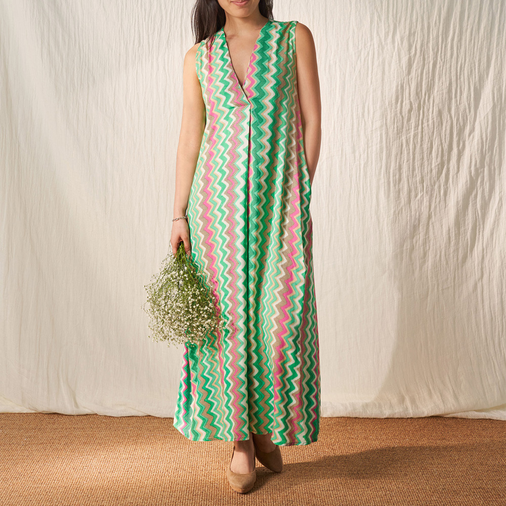 Vestit llarg amb escot en V i butxaques. El seu teixit és suau, molt agradable al tacte. Aquesta fibra es molt fresca i transpirable. Una peça de vestir molt còmoda i amb múltiples utilitats: per portar a la platja, per casa o on et vingui de gust. És el complement idear per a t'acompanyi aquest estiu.