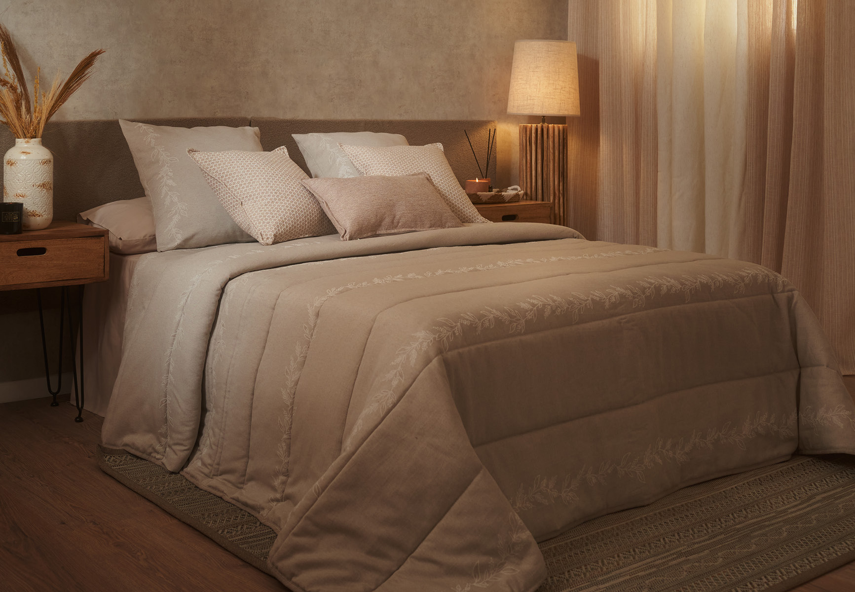Stylish and lightweight high quality duvet made of jacquard weave, 50% cotton and 50% polyester. Filled with 80 gsm polyester. Rounded end tips. Warm and cosy bouty duvet, ideal for cold nights. Thanks to its timeless style, it is suitable for any kind of environment. Easy to wash. Decorating your bed has never been so easy and practical. Matching cushion covers available, sold separately. Made in Portugal.