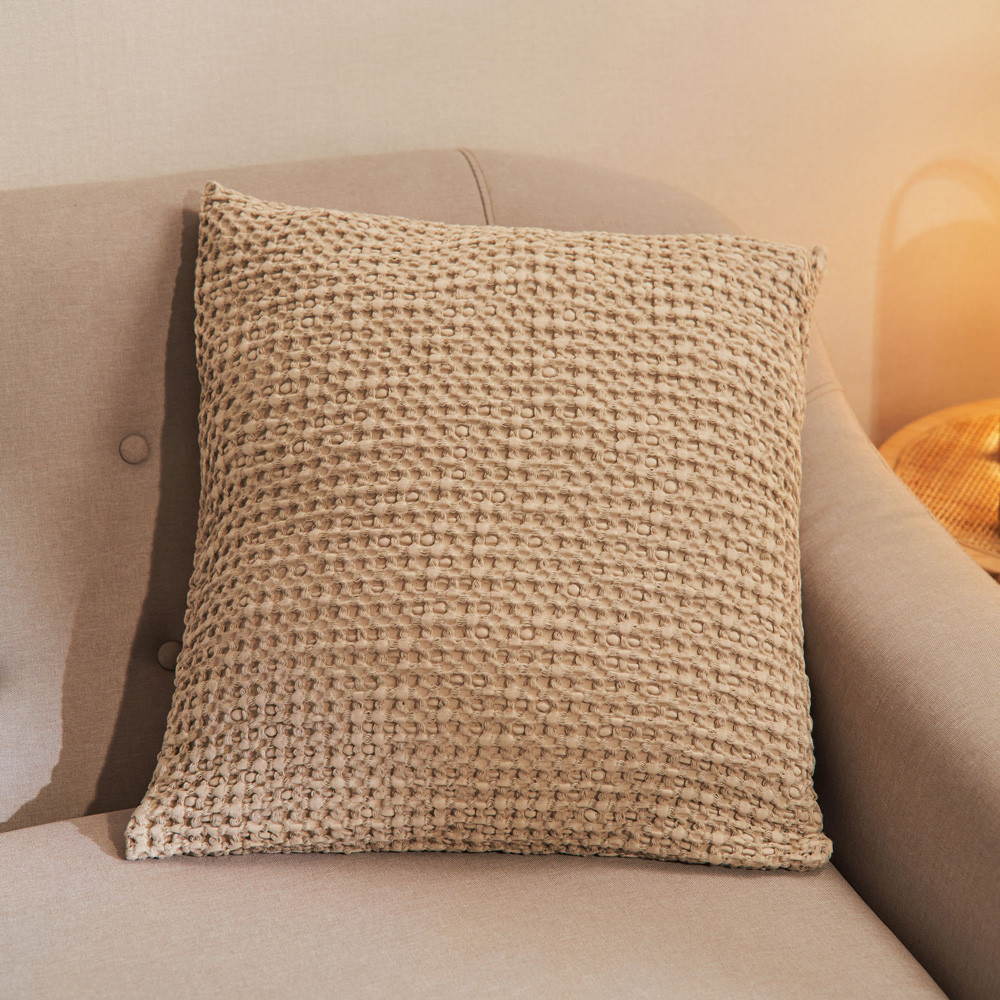 Stone-washed effect cushion cover, woven in cotton 100%. Density: 380 gsm. Very soft and pleasant to the touch. Elegant, modern and timeless design, ideal for dressing up your bed or decorating other rooms in your home. With hidden zipper closure. Combine and create a unique decoration in your home with the matching bedspreads. Infilling not included. Made in Portugal.