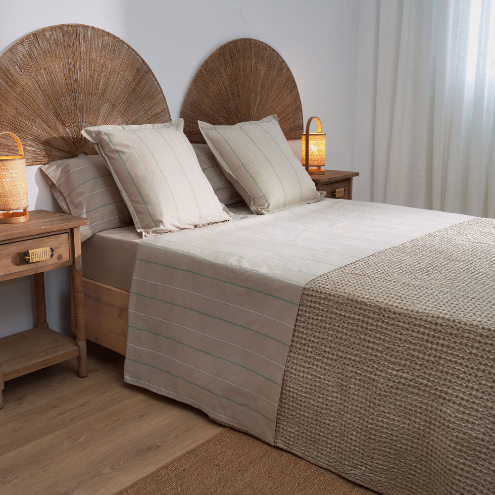 Complete Bed, 3 pieces with 144 threads of 100% cotton. Include top and bottom sheet and 1 pillow case (2 pillow cases in Queen 135cm, King 150-160 and Super King 180-200cm bed sizes). Cotton is a breathable, hypoallergenic natural fiber that has a soft touch. It is a cool fabric on warm days and provides warmth on cold days. Oeko-Tex 100 certified: every component of this article, has been tested for harmful substances and that the article therefore is harmless for human health. It is resistant to high temperature washing. Decorate your bed has never been so simple and practical. Combined with our collections of cushion and duvet covers. Made in Portugal. The sets include:- for bed 90cm: 1 bottom sheet (160x270cm), 1fitted sheet (90x190/200cm) , and 1 pillow case (47x110cm).- for bed 105cm: 1 bottom sheet (190x270cm), 1fitted sheet (105x190/200cm) , and 1 pillow case (47x120cm).- for bed 135cm: 1 bottom sheet (210x270cm), 1 fitted sheet (135x190/200cm) and 2 pillow cases (47x75cm).- for bed 150cm: 1 bottom sheet (240x270cm), 1 fitted sheet (155x190/200cm) and 2 pillow cases (47x85cm).- for bed 160cm: 1 bottom sheet (270x270cm), 1 fitted sheet (280x280cm.) and 2 pillow cases (47x100cm).All fitted sheets ara suitable for mattresses up to 31cm deep.This sheet set has a length of 270cm, this is designed so that the excess fabric can be tucked under the mattress to ensure a better grip of the duvet filling and prevent it from moving.