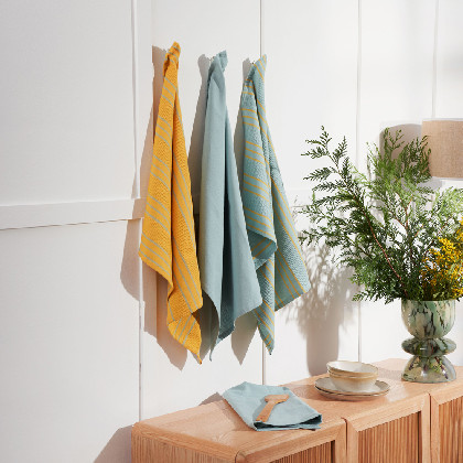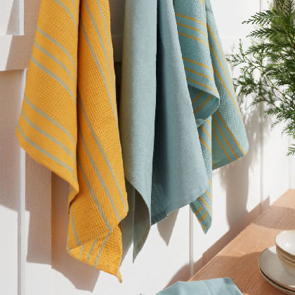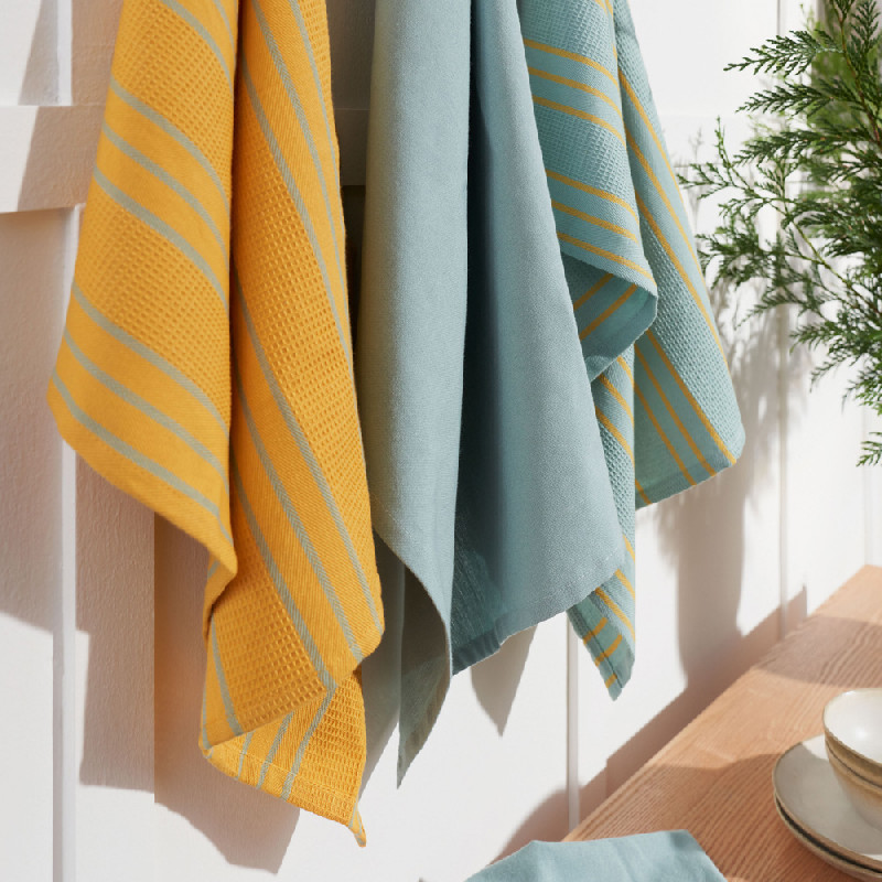 A waffle kitchen towel. Made with a double-sided fabric: waffle on one side and terry on another. This combination offers high absorbency and a light weight. 400 gsm 100% cotton. Very soft and absorbent, ideal for drying glasses and dishes, or cleaning surfaces. Care advises: maximum washing temperature 60°C. Not to use fabric softeners, dry on air or short circle tumble dry. Available in different plain colours. Combine them as you like and give your kitchen a cheerful and modern touch.