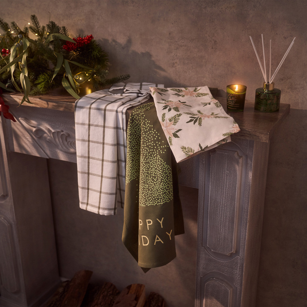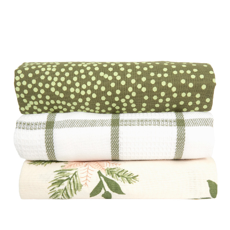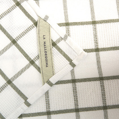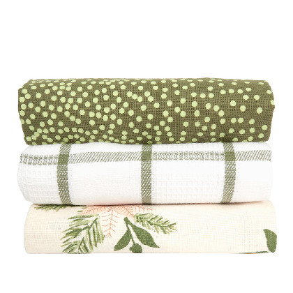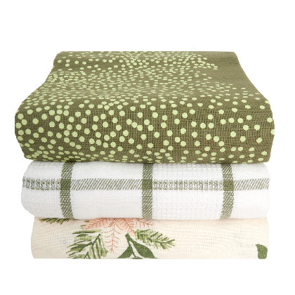 Pack of 3 waffle kitchen towels in colour Green. This set incluse: 2 terry kitchen towels with jacquard details 420 gsm 100% cotton, and 1 waffle kitchen towel, Made with a double-sided fabric: waffle on one side and terry on another. This combination offers high absorbency and a light weight. 400 gsm 100% cotton. Very soft and absorbent, ideal for drying glasses and dishes, or cleaning surfaces. Care advises: maximum washing temperature 60°C. Not to use fabric softeners, dry on air or short circle tumble dry. The pack incluse 3 kitchen towels of the same model in different colors. Size: 50x50cm. Lovely detail for a friend or host. Made in certified factories in Turkey following an environment friendly process.