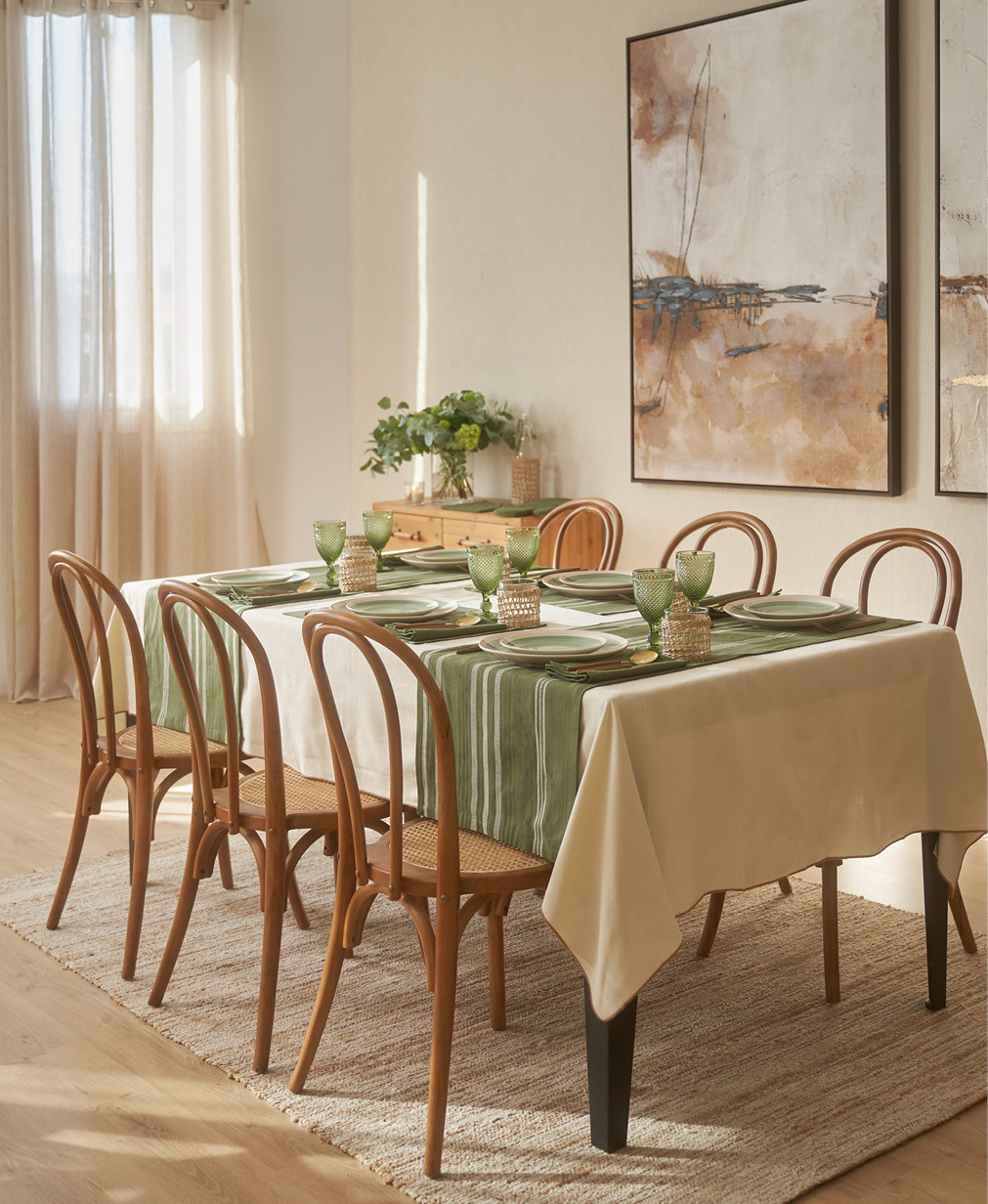 Textile touch tablecloth made with anti-stain treatment, which helps to repel spilled liquids avoiding the formation of stains. It has double barrier protection, in use and during washing. Easy removal of stains in the wash, even at low temperatures. Improved resistance and long-lasting. Made in Spain.