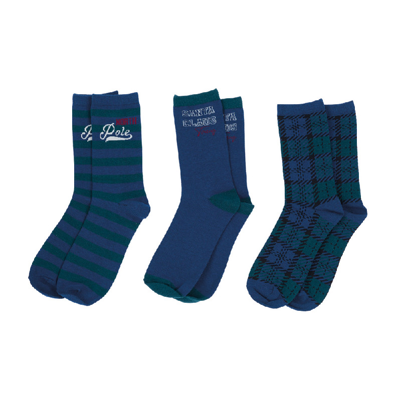 Pack de 3 calcetines con motivos navideños en jacquard. Tejido agradable al tacto, mezcla de algodón suave con remate superior elástico. Una prenda imprescindible para la temporada de frío. Talla única ( 40 -45 EU). Vienen en una caja de regalo, lo que los convierte en un regalo ideal para cualquier ocasión.