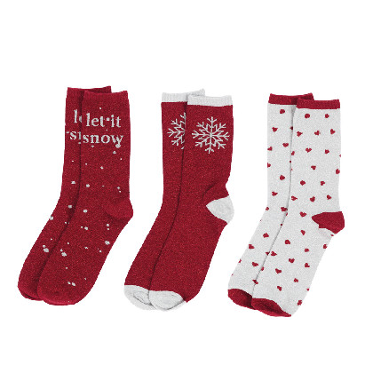Pack de 3 calcetines con motivos navideños en jacquard y detalles en lurex. Tejido agradable al tacto, mezcla de algodón suave con remate superior elástico. Una prenda imprescindible para la temporada de frío. Talla única ( 36-41 EU). Vienen en una caja de regalo, lo que los convierte en un regalo ideal para cualquier ocasión.