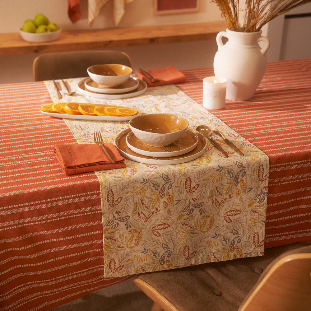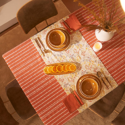 Camino de mesa estampado 100% algodón con un estilo muy actual y elegante. Camino de mesa de una capa, lo que lo hace muy ligero y se puede usar tanto como mantel para dos o tapete decorativo. El algodón es un tejido muy resistente que aporta durabilidad a toda la ropa de hogar. De lavado resistente y fácil planchado. Ideal para vestir tu mesa en las ocasiones especiales. Dale un toque personal combinándolo con las servilletas y complementos de mesa a juego.