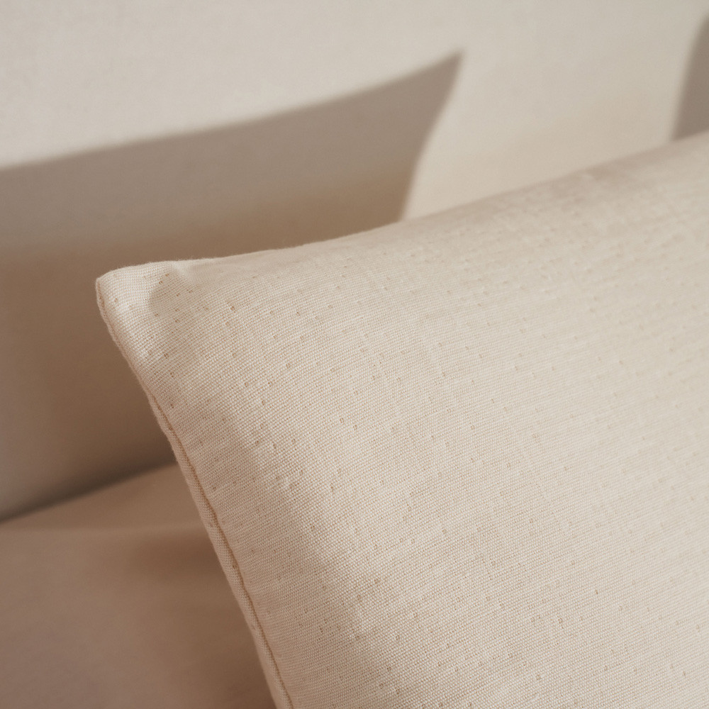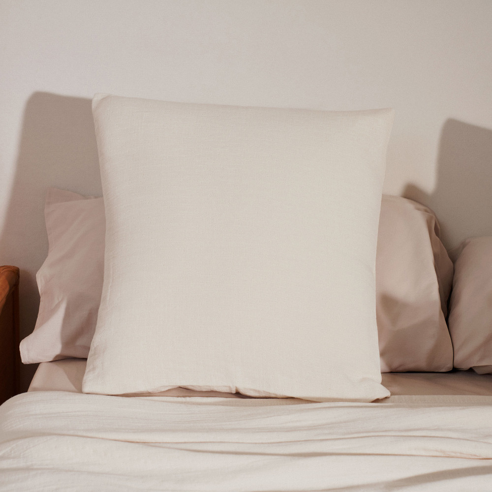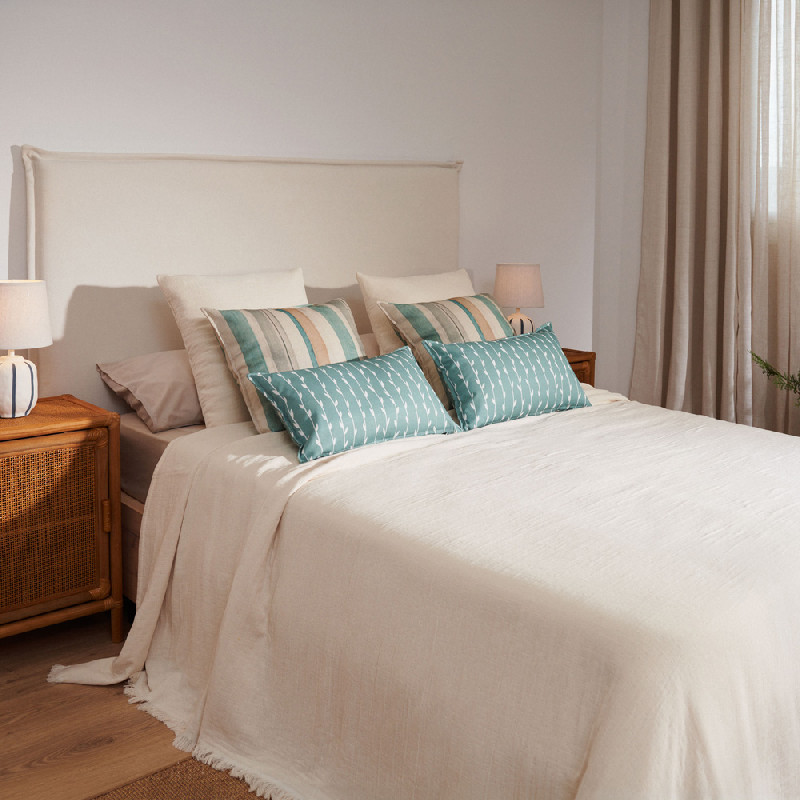 Funda de cojín tejida de algodón, diseño actual y moderno en color Crudo. Densidad: 320 gsm. Con cierre de cremallera. Combina y crea una decoración única en tu hogar con las colchas a juego. No incluye relleno. Fabricado en España.