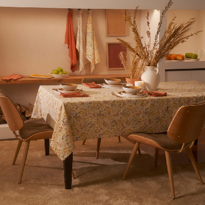 Mantel estampado 100% algodón con estilo actual y elegante. El algodón es un tejido muy resistente que aporta durabilidad a toda la ropa de hogar. De lavado resistente y fácil planchado. Ideal para vestir tu mesa en el día a día o en ocasiones especiales. Dale un toque personal combinándolo con las servilletas a juego, los individuales y los caminos de mesa. Fabricado en la India.