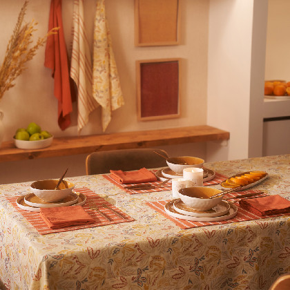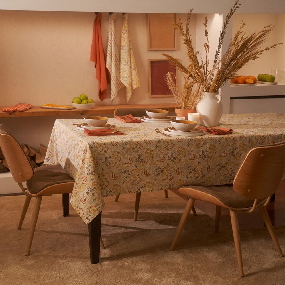 Mantel estampado 100% algodón con estilo actual y elegante. El algodón es un tejido muy resistente que aporta durabilidad a toda la ropa de hogar. De lavado resistente y fácil planchado. Ideal para vestir tu mesa en el día a día o en ocasiones especiales. Dale un toque personal combinándolo con las servilletas a juego, los individuales y los caminos de mesa.