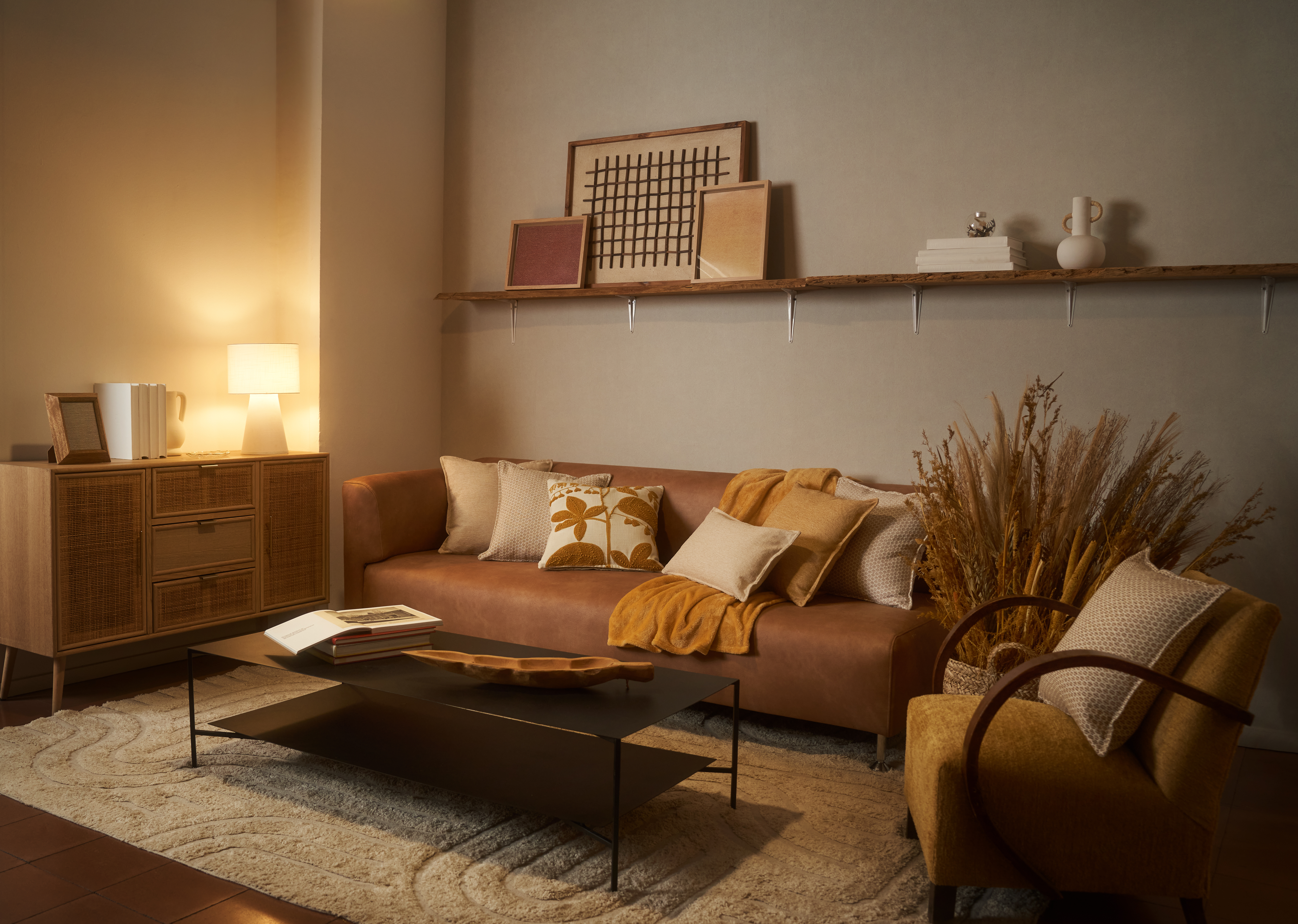 Puedes decorar el salón con una amplia variedad de complementos para el hogar; vestir el salón con cortinas confeccionadas de la tonalidad y opacidad que más te guste. Acurrúcate en el sofá con una manta y con unos cómodos cojines de salón de alta calidad y con cierre de cremallera, perfectos para combinarlos con otros textiles del salón de nuestra colección de hogar.